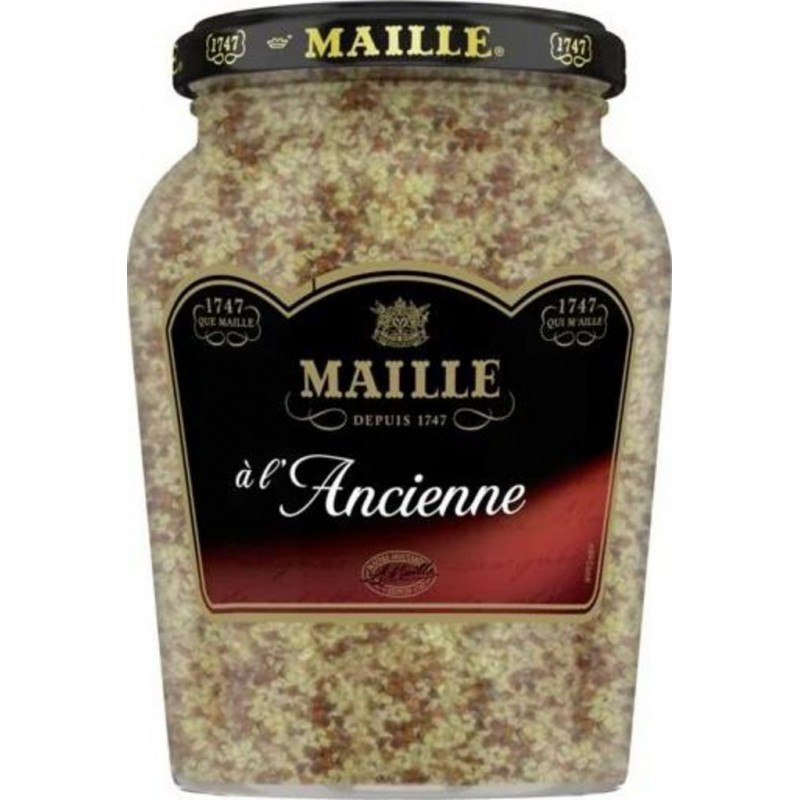 La moutarde à l'Ancienne Maille vous transporte au cœur de la Bourgogne. Un petit goût de noisette et des graines de moutarde croquantes, notre moutarde est idéale pour accompagner un gigot d'agneau ou des côtelettes de porc. Depuis près de 270 ans de tradition créative et de savoir-faire, la Maison Maille est animée par la passion d'explorer les saveurs et de faire grandir celle pour la cuisine. Fondée par Antoine-Claude Maille, maître vinaigrier, Maille ouvre sa première boutique de condiments à Paris en 1747, où lu2019on peut découvrir la richesse de ses moutardes aromatisées. Maille devient ensuite le fournisseur officiel de la cour du roi Louis XV et accède ainsi à la célébrité. Héritiers d'une créativité cultivée depuis près de 3 siècles, les chefs de la Maison Maille conçoivent chaque recette comme une œuvre d'art culinaire. Leur obsession: explorer, sélectionner et associer les meilleurs ingrédients pour apporter son supplément d'âme à chaque recette. Les produits de la marque Maille invitent à un voyage dans le monde des saveurs. Avec comme passagers de choix: le savoir-faire, la passion du détail, lu2019art de la nuance et le raffinement. Découvrez notre gamme de moutardes: moutarde de Dijon, moutarde à l'ancienne, moutarde mi-forte, moutarde fine douce et nos spécialités à la moutarde ainsi que nos recettes sur www.maille.com. Produit unitaire EAN 8720182557452.