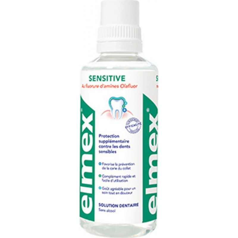 Les collets dentaires dénudés exposent les dents aux caries dentaires et à l'hypersensibilité. La Solution Dentaire Elmex Sensitive a été spécialement conçue pour protéger les collets dentaires dénudésPrévention des caries dentinaires:. Lot économique de 3 flacons. Contient deux dérivés fluorés (250ppm F): Fluorure d'amines (Olafluor), Fluorure de potassium. Aqua, Propylene Glycol, PEG-40 Hydrogenated Castor Oil, Olaflur, Aroma (menthe-eucalyptus), PVP/Dimethyaminoethylmethacrylate Polycarbamyl Polyglycol Ester, Saccharin, Hydroxyethylcellulose, Potassium, Fluoride, Potasium Hydroxide, Polyaminopropyl Biguanide. Produit unitaire EAN 3401576288590, lot de 3 EAN 3701018039743.