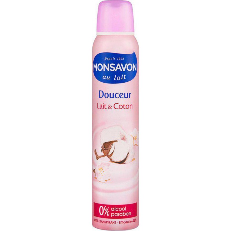 Chez Monsavon, depuis 93 ans, parce que nous sommes convaincus qu'un déodorant peut mettre de bonne humeur, nous continuons à tout mettre en œuvre pour cultiver cet esprit enjoué, cette proximité, cette naturalité. Découvrez le parfum lait et coton Efficacité 48h. Lot économique de 2. Butane, Isobutane, Propane, Cyclopentasiloxane, Aluminum Chlorohydrate, PPG-14 Butyl Ether, C12-15 Alkyl Benzoate, Parfum, Disteardimonium Hectorite, Dimethiconol, Octyldodecanol, Helianthus Annuus Seed Oil, BHT, Propylene Carbonate, Hydrolyzed Milk Protein, Citric acid, Benzyl alcohol. Produit unitaire EAN 3181730134696, lot de 2 EAN 3665816043633.