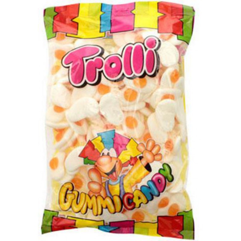De bons oeufs au plat! Conditionnement économique. Sirop de glucose, sucre, gélatine, acidifiants acide citrique, acide lactique, arômes, colorants, huile végétale, agent de séparation, cire d’abeille, cire de carnauba. Produit unitaire EAN 4000512733126.