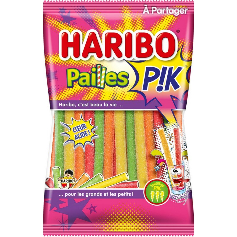 Des pailles pleines de piquant: avec une double texture et un cœur piquant. Aux délicieux goûts soda. sucre, sirop de glucose, amidon de maïs, humectant: sirop de sorbitol, acidifiant: acide citrique, farine de BLÉ, amidon de BLÉ, graisse de palme, dextrose, gélatine, émulsifiants: mono- et diglycérides d'acides gras, esters citriques de mono- et diglycérides d'acides gras, correcteur d'acidité: citrate trisodique, arôme, concentrés de fruits et de plantes: cassis, baie de sureau, aronie, raisin, extrait de baie de sureau, colorants: curcumine, bleu patenté V. Tenir à l'abri de la chaleur et de l'humidité. Peut contenir des traces de LAIT. Produit unitaire EAN 3103220043325.
