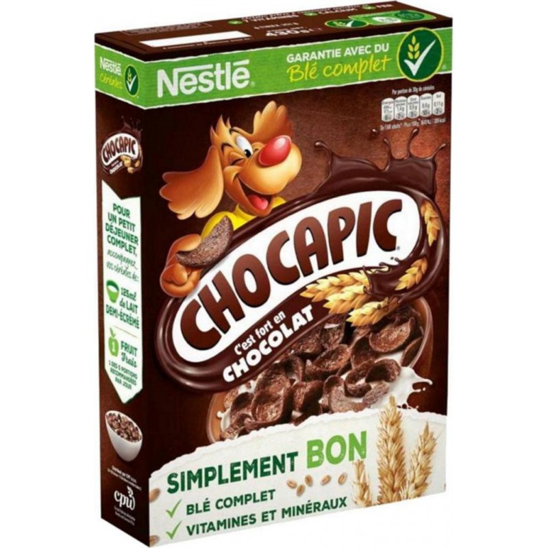 Céréales au blé complet au bon goût de chocolat. Céréales 61.9% (blé complet 31.8%, farine de blé, semoule de maïs), chocolat en poudre 22.2% (sucre, cacao en poudre), sucre, sirop de glucose, extrait de malt d'orge, huile de palme, émulsifiant: lécithine de tournesol ; sel, arômes. Vitamines (niacine (PP), acide pantothénique (B5), riboflavine (B2), vitamine B6, thiamine (B1), acide folique (B9), vitamine D) et minéraux (carbonate de calcium, fer). Substances ou produits provoquant des allergies ou intolérances: Gluten. Produit unitaire EAN 7613034626844.