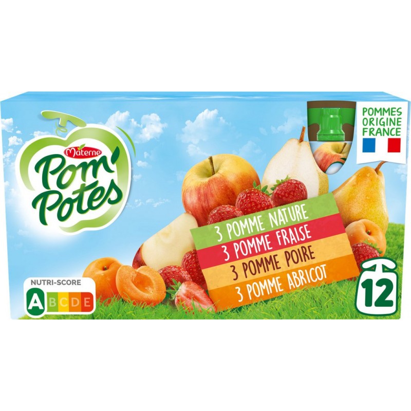 POM’POTES: Des gourdes à consommer à tout moment de la journée! Pom’Potes s’engage pour une agriculture responsable tout en proposant des produits de qualité, dans le respect des règles de nutrition, pour le bien-être et le plaisir des enfants! Une gourde Pom’Potes correspond à 1 des 5 portions de fruits et légumes recommandées quotidiennement Des recettes allégées en sucres* L’origine française de nos pommes est garantie Nos fournisseurs de pommes s’efforcent d’appliquer le principe de la « lutte intégrée », en réduisant au strict nécessaire le traitement des vergers Des recettes sans conservateurs: une simple pasteurisation permet de conserver les gourdes à température ambiante sans ajout de conservateurs Une ouverture facile des gourdes par les enfants avec l’Héli’Bouchon plus pratique * 30% de sucres en moins qu’une compote classique. Pomme: pomme 96,2%, sucre, jus de citron concentré (si nécessaire pour réguler l’acidité), antioxydant: acide ascorbique. Pomme Fraise: pomme 72,3%, fraise 21,6%, sucre, cassis, antioxydant: acide ascorbique. Pomme Poire: pomme 69,5%, poire 26,1%, sucre, arôme naturel de poire, jus de citron concentré (si nécessaire pour réguler l’acidité), antioxydant: acide ascorbique. Pomme Abricot: pomme 70,4%, abricot 25,6%, sucre, jus de citron concentré (si nécessaire pour réguler l’acidité), antioxydant: acide ascorbique. Produit unitaire EAN 3021762512171.
