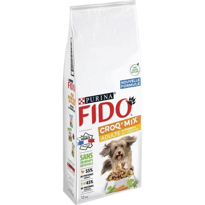 FIDO CROQ MIX ADULT.POULET12KG ALIMENTS POUR CHIENS ALIMENTS SECS CHIENS.Aliment complet pour chiens adultesBœuf, source de protéines de qualité, qui contribuent à maintenir des muscles forts et une bonne condition physiqueAvec un mélange de légumes sources de fibresDes acides gras Oméga 3 et 6 Description marketing FIDO® S’ENGAGE Avec FIDO® CROQ’ MIX®, offrez à votre chien une nutrition équilibrée et savoureuse, avec des ingrédients de qualité soigneusement sélectionnés pour le plus grand plaisir de votre chien. Fabriqué en France Avec 70% d’ingrédients d'origine France(1)(1) blé et ses dérivés Le plaisir d’un délicieux mélange croquant pour un repas 100% complet et équilibré 55% de protéines animales 45% de protéines végétales(2) (2) sur le total des protéines du produit Des croquettes à la forme et à la texture unique(3) qui encouragent la mastication et aident votre chien à garder une dentition forte. (3) comparé à la gamme de produits PURINA® standard POUR ENCORE PLUS DE PLAISIR Découvrez les friandises FIDO®. Céréales, Viandes et sous-produits animaux (18%, dont 4% de poulet), Sous-produits d'origine végétale (dont 0,08% de persil séché), Huiles et graisses, Substances minérales, Extraits de protéines végétales, Légumes (0,5% de pois séchés, 0,08% de carottes séchées, 0,08% d'épinard séché). équivalent à 4% de légumes réhydratés (pois, carottes, épinard). Produit unitaire EAN 7613287007025.