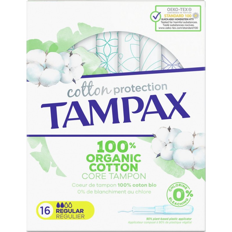 Le cœur des tampons Tampax Cotton Protection est fabriqué en coton 100% biologique. De plus, ils sont les meilleurs tampons de la gamme Tampax pour le confort et la protection. Ils sont sans parfum, sans colorant, et sans blanchiment au chlore. Ils sont dotés d’un applicateur en plastique végétal avec embout arrondi pour une insertion facile. Dotés de la technologie MotionFit, les tampons Tampax Cotton Protection se dilatent délicatement de manière à épouser la forme unique de votre corps. En plus, la tresse anti-fuites LeakGuard aide à éviter les fuites avant qu’elles ne surviennent. Les tampons Tampax Cotton Protection Régulier sont parfaitement adaptés aux flux légers à moyens. Les tampons Tampax Cotton Comfort ont été testés sous contrôle gynécologique. De plus, ils ont été testés indépendamment par Oeko-Tex Standard 100 sur la présence des substances indésirables. Pour en savoir plus sur nos produits, rendez-vous sur notre site Web. Composé de: coeur de coton bio, tresse anti-fuites en polypropylène, fil de polyester. Produit unitaire EAN 8001841385730.