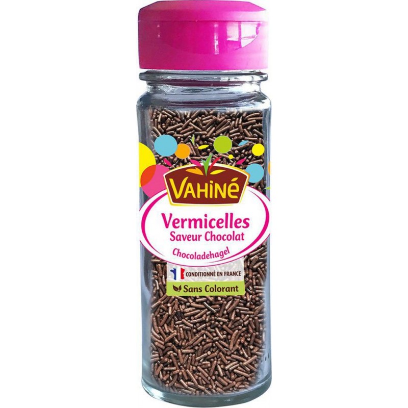 Ces vermicelles Vahiné au goût délicieusement chocolaté apporteront une touche de gourmandise et d'originalité à tous vos desserts. Les décors à parsemer Vahiné sont disponibles dans un flacon en verre muni d’un tamis: pratique pour saupoudrer toutes vos créations! Lot économique de 3 flacons. Sucre, amidon de BLE, poudre de cacao maigre (13%), farine de BLE, huile de palme, matière grasse de karité, émulsifiant: lécithine de colza, agents d'enrobage: gomme arabique, shellac. Peut contenir LAIT. Produit unitaire EAN 3179140313046, lot de 3 EAN 3701018087560.