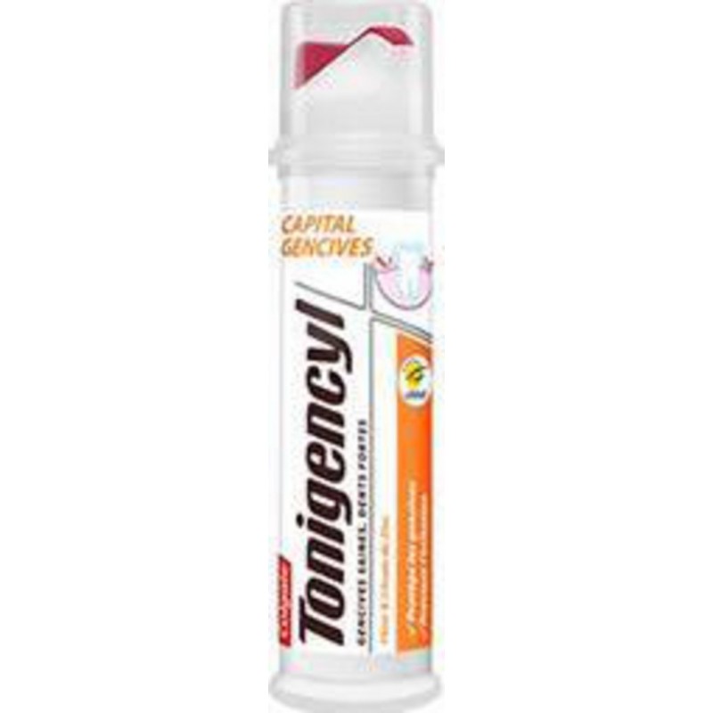 TONIGENCYL DOSEUR 100ML DENTAIRE DENTIFRICES. Aqua, hydrated silica, glycerin, peg-12, tetrapotassium pyrophosphate, zinc citrate, pvm/ma copolymer, sodium lauryl sulfate, aroma, potassium hydroxide, cellulose gum, sodium chloride, potassium nitrate, sodium saccharin, xanthan gum, commiphora myrrha oil, chamomilla recutita flower extract, salvia officinalis oil, mentha piperita oil, limonene, Cl77891.u003cbr Contient des dérivés fluorés: sodium fluoride 0,32% 1450 ppm F. Produit unitaire EAN 3015810597326.