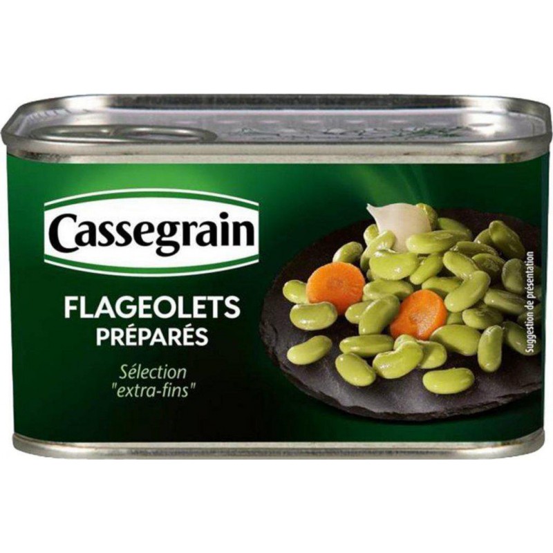 Découvrez le fondant incomparable des flageolets cuisinés Cassegrain. Lot économique de 2. Flageolets verts 50%, eau, carottes 1.6%, sel, oignon grelot 0.4%, arômes, graisse de poulet 0.05%, épices. Produit unitaire EAN 3083680085335, lot de 2 EAN 3665816047082.