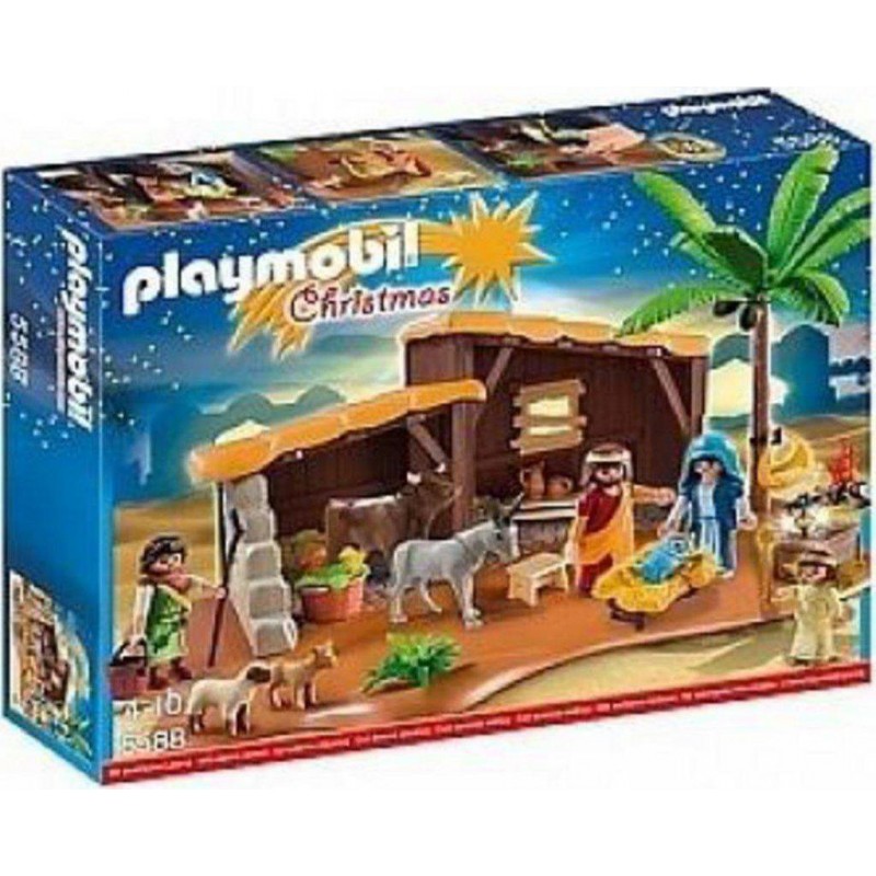 Crèche décorée comprenant quatre personnages, quatre animaux (vache, âne, veau, mouton) et de nombreux accessoires (feu, lanterne, panier, cocotier, …). La lanterne s'illumine (Pile fournie). Crèche de Noël. Produit unitaire EAN 4008789055880.