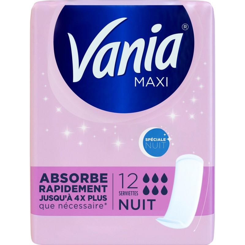 Absorbe rapidement jusqu'à 4x plus que nécessaire* Les serviettes Vania® Maxi Nuit vous offrent une protection optimale! Grâce à une technologie ultra absorbante et un adhésif ultra performant, les serviettes Vania® Maxi Nuit absorbent rapidement jusqu'à 4 fois plus que nécessaire* et restent parfaitement en place. Ultra souples, les serviettes Vania® Maxi Nuit disposent d'un voile micro-aéré testé dermatologiquement pour un confort optimal la nuit. Longueur spéciale nuit Voile testé dermatologiquement Absorption rapide Ultra souple *Basé sur les performances d'absorption des serviettes et sur les données moyennes de flux menstruel, considérant que les serviettes sont changées régulièrement. Chaque femme est unique et vos règles peuvent évoluer chaque mois. Vania® vous aide à choisir la serviette la plus adaptée à vos besoins: Flux normal Maxi Normal - Absorption: 2/6 Flux normal Maxi Normal - Absorption: 3/6 Flux abondant Maxi Super - Absorption: 4/6 Flux abondant Maxi Super - Absorption: 5/6 Flux nocturne Maxi Nuit - Absorption: 6/6 Flux nocturne Maxi Nuit - Absorption: 6/6 Les serviettes Maxi Confort Super existent aussi en version Fresh & Aloe Vera. Vania à votre écoute au 00 800 555 22 000 (Appel gratuit depuis un poste fixe). Produit unitaire EAN 3574661419435.