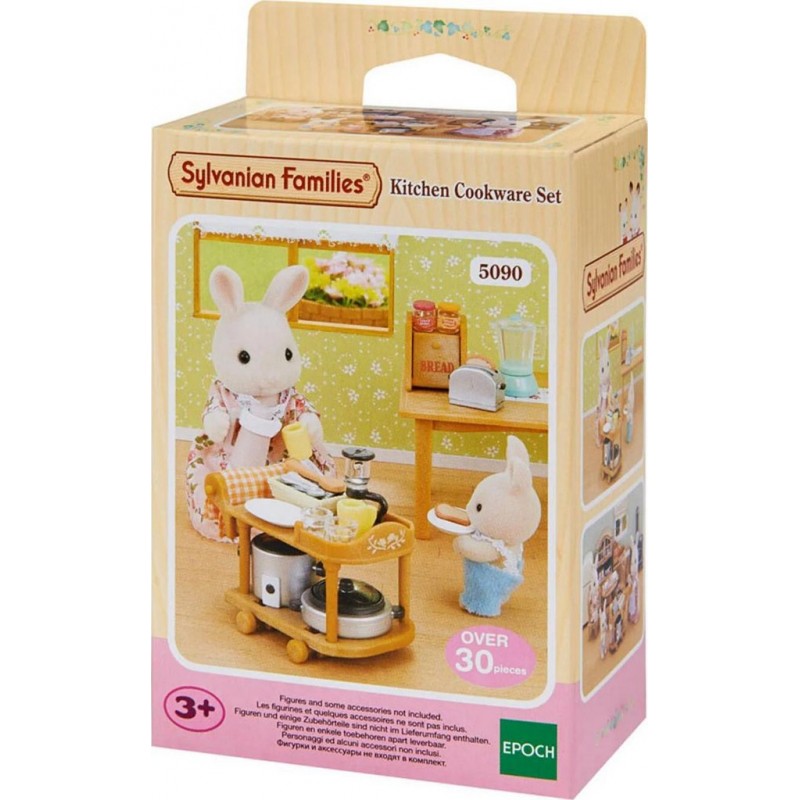 Ce set comprend 1 table roulante à double plateau, 1 boîte à pain, 1 cafetière, 1 grille pain, 1 thermos, 1 shaker, 1 cuit vapeur et plus de 20 accessoires pour compléter les ustensiles de cuisine déjà à disposition chez les Sylvanian Families. Produit unitaire EAN 5054131050903.