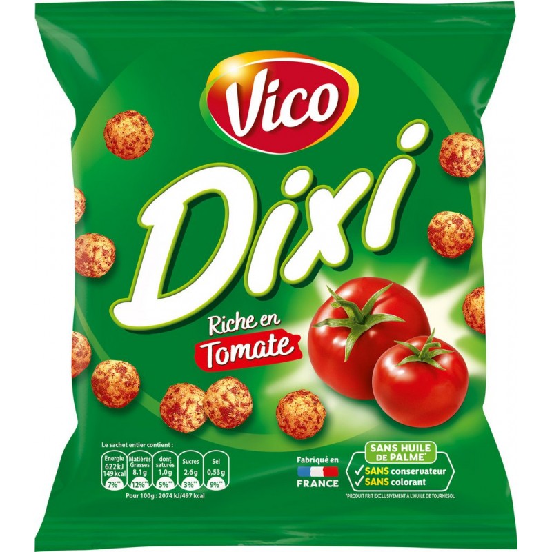 Dixi, c'est une boule de maïs soufflé croustillante et un goût de tomate intense et irrésistible! Connaissez-vous le secret de sa saveur incomparable? - Des ingrédients soigneusement sélectionnés - Une huile 100% tournesol - Une fabrication sans colorant ni conservateur. Semoule de maïs 47%, ARACHIDES grillées 18%, huile de tournesol, tomate 13%, sel, paprika, dextrose, extraits d'épices. Traces éventuelles de LAIT, FRUITS A COQUE. Produit unitaire EAN 3336971303060.