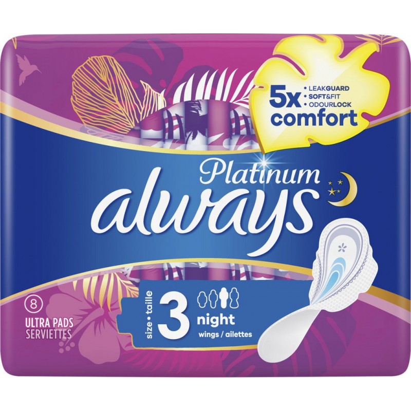 Grâce au système Zero Feel, les serviettes hygiéniques Always Platinum vous permettent de passer votre journée sans soucis. Ces serviettes hygiéniques vous offrent du confort en quintuple : des ailettes ultra-douces, des zones de protection 3D LeakGuard, 1 000 micro-coussins doux, un design doux & flexible et la technologie de neutralisation des odeurs OdourLock. Recommandées pour la journée et la nuit, les serviettes hygiéniques Always Platinum Night (taille 3) avec ailettes sont idéales pour les flux moyens à abondants. Essayez les serviettes hygiéniques Always Platinum Secure Night (taille 4), la protection Always Platinum parfaitement adaptée pour la nuit. Composition: Voile de surface (tissu doux imaginé pour retenir le fluide loin de la peau): Fibres synthétiques comme celles utilisées dans les vêtements et les sous-vêtements. / Cœur absorbant (partie de la serviette qui capture et retient le fluide): Cellulose absorbante, aussi utilisée dans divers produits du quotidien comme les sachets de thé ou les vêtements. / Film extérieur (partie douce qui maintient le fluide à l'intérieur de la serviette): Fibres synthétiques comme celles utilisées dans les vêtements et les sous-vêtements. / Technologie de neutralisation: une technologie brevetée qui permet de neutraliser les odeurs plutôt que de simplement les masquer. / Adhésifs: utilisés pour que la serviette adhère au sous-vêtement. / Papier apposé sur les ailettes (protège les adhésifs avant d'utiliser la serviette): Papier imprimé. Produit unitaire EAN 8001090899132.