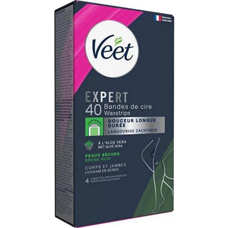 Les bandes de cire Veet sont conçues par des professionnels. Convient aux peaux sèches, au corps et aux jambes Notre languette EasyGripTM a été conçue par des experts et vous aide à retirer les poils les plus courts* à la racine, dès la première application. Avec de l'huile d'amande, connue pour ses propriétés sous-jacentes ; laisse la peau exfoliée et l'assurance d'une douceur longue durée. Testé dermatologiquement Dans ce paquet 40 bandes de cire 4 lingettes finition parfaite post-épilation à l'huile d'argan *1,5 mm Veuillez lire attentivement les précautions d emploi sur l emballage avant d utiliser les Bandes de Cire Veet. A UTILISER SUR PEAU PROPRE ET SECHE. VOUS POUVEZ REUTILISER LES BANDES PLUS D UNE FOIS PAR SEANCE D EPILATION JUSQU A CE QU ELLES N ADHERENT PLUS. Produit unitaire EAN 3059944011655.