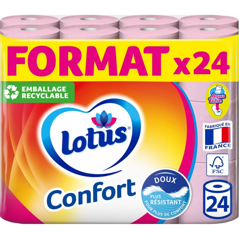 Lotus Confort vous offre un équilibre parfait entre douceur et résistance pour un confort optimal. Grâce à l’expertise Lotus dans la sélection des fibres vierges de grande qualité, Lotus Confort vous offre un équilibre parfait entre douceur et résistance pour un confort optimal. Et en plus, son tube Aqua Tube est jetable dans les toilettes, biodégradable et recyclable. Le complément idéal au papier toilette humide! Lotus Confort est fabriqué en France. Ouate de cellulose, pure pâte vierge. Papier toilette 2 épaisseurs. Fabriqué en France. Lotus Confort 151 Boulevard Victor Hugo CS80047 93588 Saint-Ouen Cedex Lotus Confort à votre écoute N°Cristal 09 69 32 20 50 (appel non surtaxé - France uniquement). Produit unitaire EAN 3133200094856.