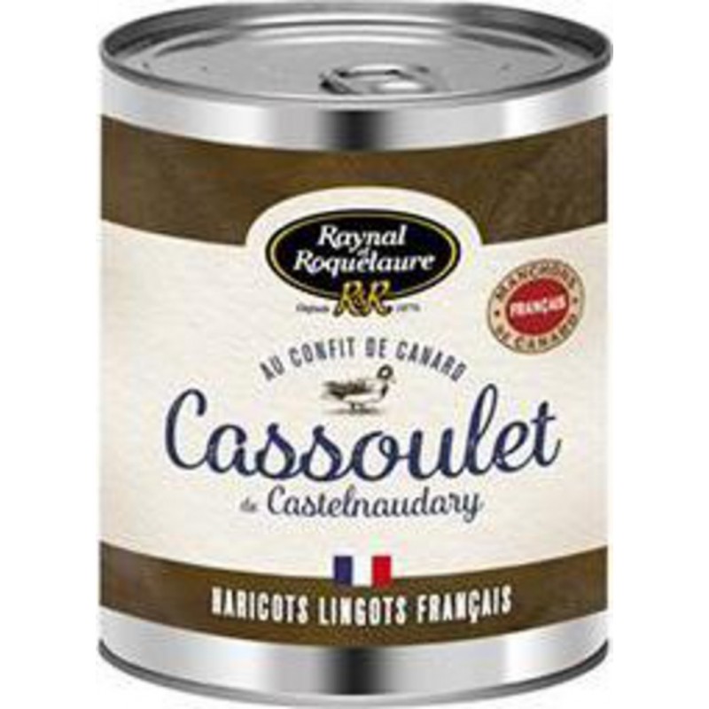 Haricots lingots français. Manchons de canard français. Nos saucisses sont fabriquées de façon traditionnelle avec des boyaux naturels de porc, leur forme peut donc varier. ">Haricots lingots précuits 31%, eau, manchons de canard confits 16% (manchons de canard gras, graisse de canard, sel), saucisses de Toulouse précuites 12% (viande de porc, sel, poivre, boyau naturel), graisse d'oie, oignons frits (oignons, huile de tournesol), couennes de porc, sel, ail, purée de tomate, ail en poudre, poivre. Fabriqué dans un atelier utilisant: blé, lait, œuf, céleri, moutarde, poisson, crustacés et mollusques. Sans colorant. Sans conservateur. Sans arôme.