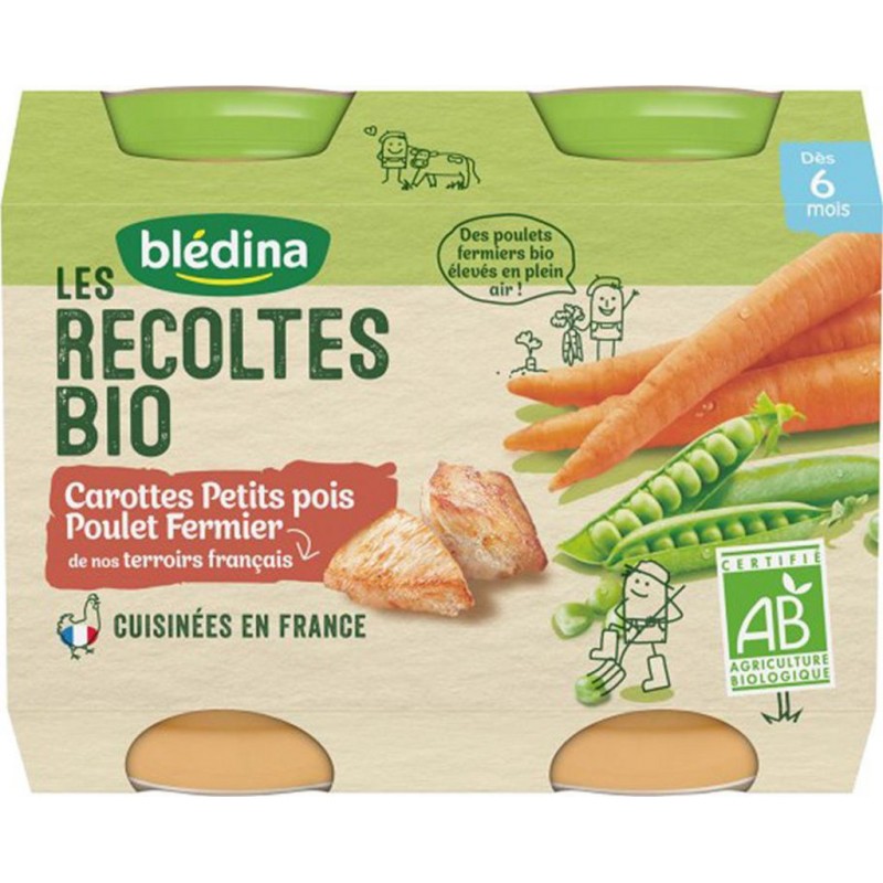 Les Récoltes Bio, de délicieux petits pots bio pour faire découvrir à bébé ses premiers légumes et viandes tout en douceur. 1/3 de carotte 36,0% - Eau de cuisson - 61 petits pois 20,0% - 1 morceau de pomme de terre- 16g de viande de poulet* 8,00% - Huiles végétales* (colza, tournesol) - Produits issus de l'agriculture biologique. Produit unitaire EAN 3041091289773.