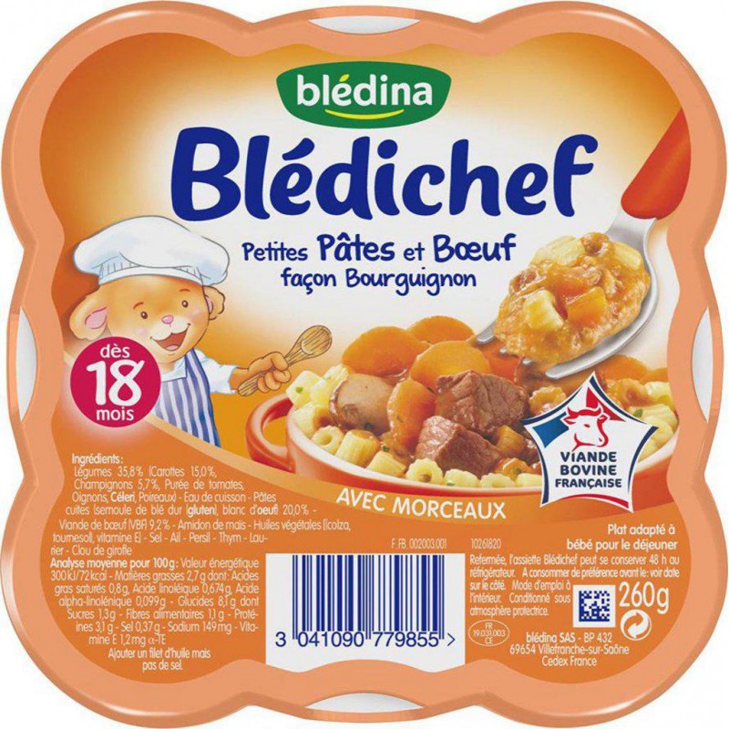 Blédichef propose une large gamme de plats savoureux pour le déjeuner et le dîner, spécialement élaborés pour régaler votre bébé en toute sérénité et lui faire découvrir chaque jour de nouvelles saveurs! Lot économique de 8 assiettes. Légumes 35,8% (Carottes 15,0%, Champignons 5,7%, Purée de tomates, Oignons, Céleri (CÉLERI), Poireaux) - Eau de cuisson - Pâtes cuites (semoule de blé dur (GLUTEN), blanc d’œuf) 20,0% (ŒUF,GLUTEN) - Viande de bœuf (VBF) 9,2% - Amidon de maïs - Huiles végétales (colza, tournesol), vitamine E - Sel - Ail - Persil - Thym - Laurier - Clou de girofle. Produit unitaire EAN 3041090779855, lot de 8 EAN 3701018077905.