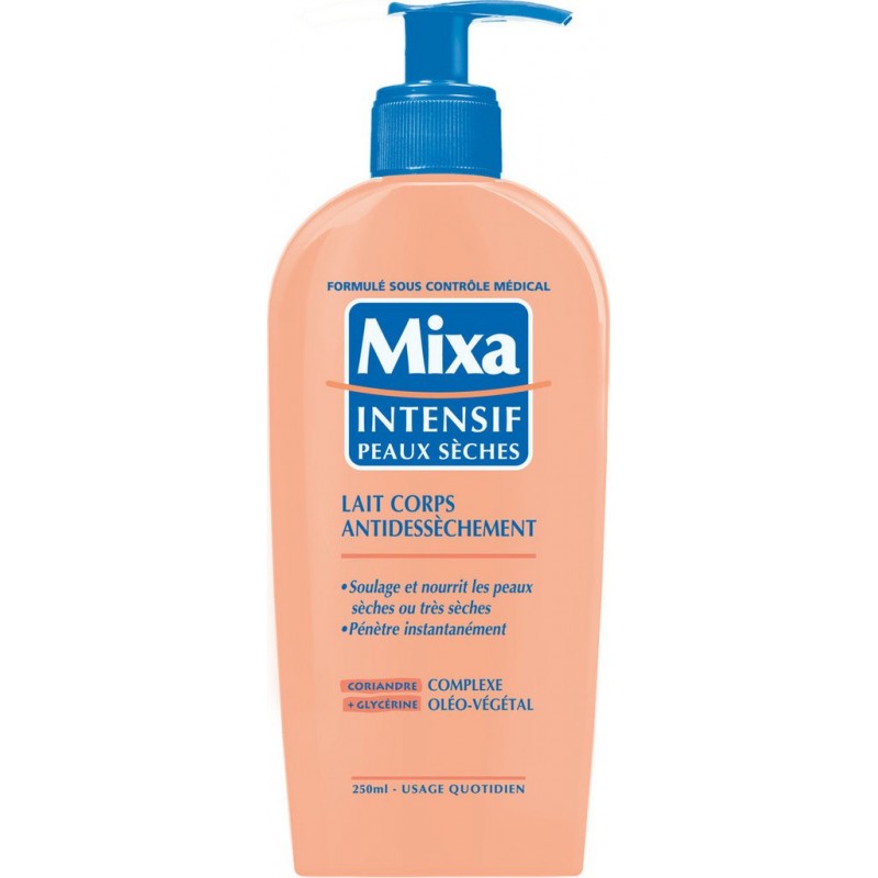 Lait Corps Anti-dessèchement Mixa conçu pour nourrir et soulager les peaux sèches ou très sèches. Soulagée et nourrie, votre peau retrouve sa douceur et sa souplesse naturelles. 601222 63 - AQUA / WATER - PETROLATUM - GLYCERIN - PARAFFINUM LIQUIDUM / MINERAL OIL - CYCLOPENTASILOXANE - ELAEIS GUINEENSIS OIL / PALM OIL - ALUMINUM STARCH OCTENYLSUCCINATE - STEARETH-2 - STEARETH-20 - ALLANTOIN - METHYLPARABEN - CARBOMER - PROPYLPARABEN - CORIANDRUM SATIVUM SEED OIL / CORIANDER SEED OIL - SODIUM CETEARYL SULFATE - CETYL ALCOHOL - SODIUM HYDROXIDE - CHLORHEXIDINE DIGLUCONATE - DISODIUM EDTA - BENZYL SALICYLATE - LINALOOL - HEXYL CINNAMAL - BENZYL ALCOHOL - LIMONENE - CITRONELLOL - HYDROXYCITRONELLAL - GERANIOL - STEARYL ALCOHOL - MYRISTYL ALCOHOL - CETEARYL ALCOHOL - SODIUM SULFATE - EUGENOL - CITRAL - PARFUM / FRAGRANCE (F.I.L. B192576/1). Les listes d’ entrant dans la composition des produits de notre marque sont régulièrement mises à jour. Avant d’utiliser un produit de notre marque, vous êtes invités à lire la liste d’ figurant sur son emballage afin de vous assurer que les sont adaptés à votre utilisation personnelle. Produit unitaire EAN 3600550454130.