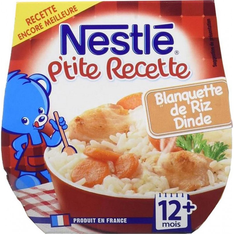 Découvrez Nestlé P’tite Recette Blanquette de Riz Dinde: un délicieux petit plat inspiré des grands classiques de la cuisine française adapté à bébé dès 12 mois. Une recette gourmande produite en France qui ravira les papilles de bébé. Eau de cuisson, légumes 25% (carottes 10,5%, pommes de terre, panais, oignons), riz cuit 9%, viande de dinde 8,8% (origine: France), champignons, CREME 3,3%, amidon, semoule de riz, huile de colza, sel marin, persil 0,025%. Produit unitaire EAN 7613035856585.