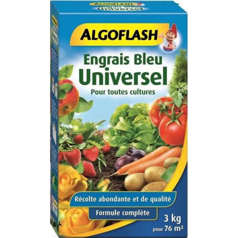 Engrais complet granulé - S'utilise pour toutes les cultures: légumes, petits fruits, arbres fruitiers et d'ornement, rosiers, fleurs et gazon - Avec magnésie, bore et zinc - Favoriser la floraison, une récolte abondante et renforce le coloris des fleurs - Le bleu permet un meilleur contrôle de l'épandage - Poids: 3Kg. Produit unitaire EAN 3167770205701.