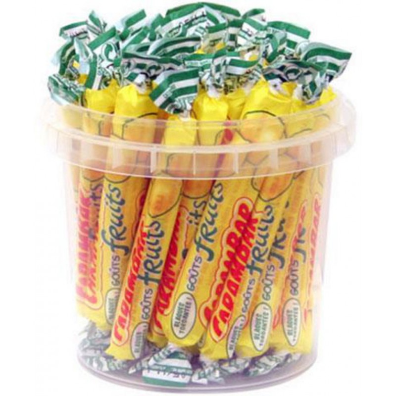 Un boîte pour avoir ces délicieus Carambar Citron, partout avec soi. sirop de glucose, sucre, huile de coprah hydrogénée, acidifiant acide citrique, gélatine, arômes naturels, émulsifiant E471, colorants E104 E129, traces d’arachide, de fruits secs ou de protéines de lait. EAN 3701018001511.
