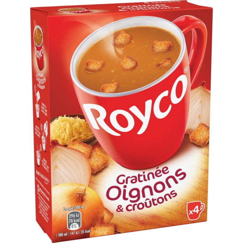 Royco, quand la pause s'impose! Au travail Dans la matinée À la maison Dans l'après-midi Pour varier vos pauses, découvrez nos autres recettes: Royco Légumes & croûtons Royco Mouliné 10 Légumes. de la soupe déshydratée: oignon 29%,CROÛTONS 27% (farine de BLÉ (GLUTEN), huile de palme, sel, levure, antioxydant: extrait de romarin),fécule de pomme de terre,sel,huile de palme,arômes (contient: CELERI, LAIT et GLUTEN),sel minéral (potassium),FROMAGE en poudre 1,1% (sels de fonte: E 339),exhausteurs de goût: E621, E627 et E631,extrait de malt d'ORGE (GLUTEN),acidifiant: acide citrique,sirop de glucose,CELERI,protéines de LAIT. Peut contenir des traces de SOJA. Produit unitaire EAN 3036812020704.