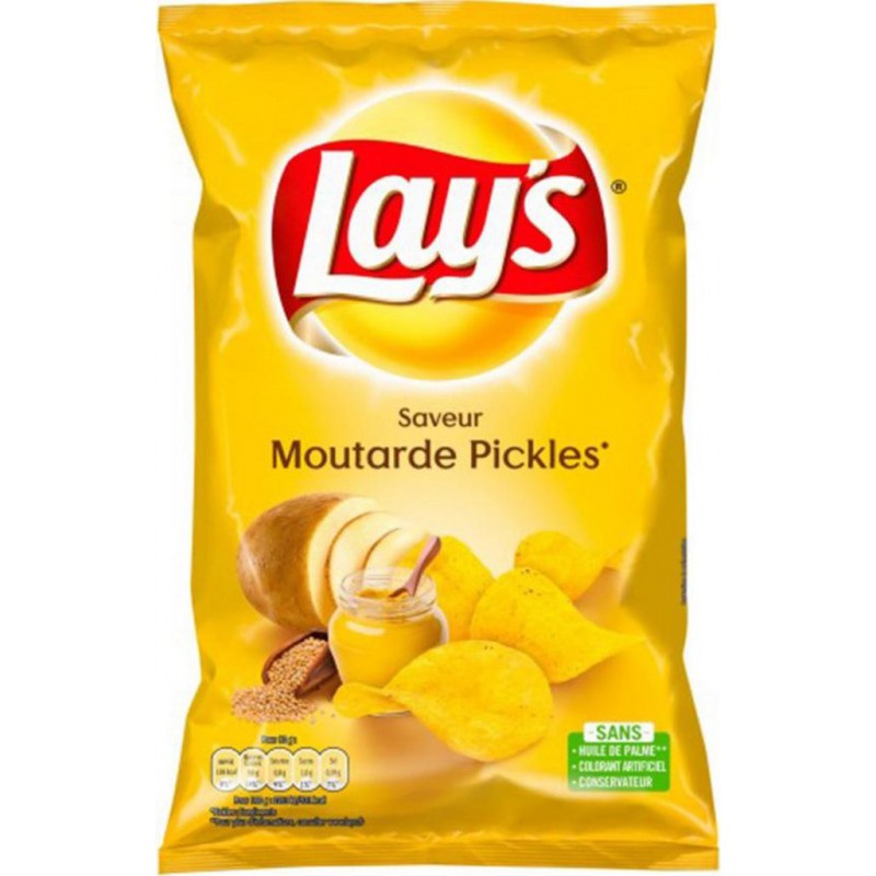 Depuis 1932, l'expertise de Lay's c'est: Des pommes de terre soigneusement sélectionnées avec nos agriculteurs partenaires et une attention toute particulière pour obtenir un goût et un croustillant d'exception. Les chips préférées des Français. Lot économique de 10 paquets. pommes de terre 60%,huiles végétales (tournesol, colza, en proportion variable),base aromatisante moutarde pickles LACTOSE (de LAIT), sucre, correcteurs d'acidité (acide citrique, diacétate de sodium), épices, MOUTARDE, arômes (dont MOUTARDE), crème en poudre (de LAIT), protéine végétale hydrolysée (de SOJA),sel. Produit unitaire EAN 3168930008118, lot de 10 EAN 3701018099938.