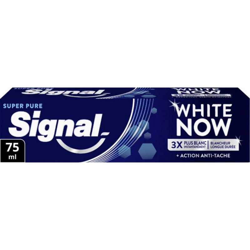 Le dentifrice Signal White Now Super Pure blanchit instantanément* vos dents et cible efficacement les taches de nicotine**, de café et de vin rouge pour une action blancheur continue. Dotée d’une technologie chromatique de pointe, la formule unique du dentifrice White Now fonctionne comme les cosmétiques correcteurs de couleurs pour éliminer le jaunissement, en renforçant la blancheur naturelle de votre propre émail pour créer instantanément une nuance unique de blanc. Cliniquement prouvé et respectueux de l'émail, ce dentifrice contient des ingrédients blancheur instantanée non abrasifs et du fluor pour un usage quotidien. Le tube du dentifrice Signal White Now Super Pure est fabriqué à partir de plastique recyclé et est 100% recyclable. Une fois vide, déposez-le dans un point de collecte TerraCycle® afin qu’il soit recyclé. Chez Signal, nous pensons que votre sourire est l’expression de votre personnalité et de votre confiance en vous. Notre mission: améliorer la santé bucco-dentaire de tous, pour que chacun d’entre nous libère le pouvoir de son sourire. Signal accompagne les Français depuis 1961 pour leur transmettre les bons gestes, dès le plus jeune âge et démontrer l’importance d’un brossage 2 fois par jour, matin et soir. Attentifs à la protection de la planète, nous prenons des mesures pour limiter l’impact environnemental de nos produits. En partenariat avec TerraCycle®, nous avons lancé un programme de recyclage gratuit, pour donner une seconde vie à vos brosses à dents et vos tubes de dentifrice. *Cliniquement prouvé sur 107 personnes. Effet blancheur instantané optique et temporaire. **Etude scientifique montrant la réduction des taches des fumeurs. Aqua, Hydrogenated Starch Hydrolysate, Hydrated Silica, PEG-32, Sodium Lauryl Sulfate, Aroma, Cellulose Gum, Sodium Saccharin, Sodium Fluoride, PVM/MA Copolymer, Mica, Glycerin, Sodium Laureth Sulfate, Lecithin, Caprylyl Glycol, CI 42090, CI 74160, CI 77891. Produit unitaire EAN 8720181327179.